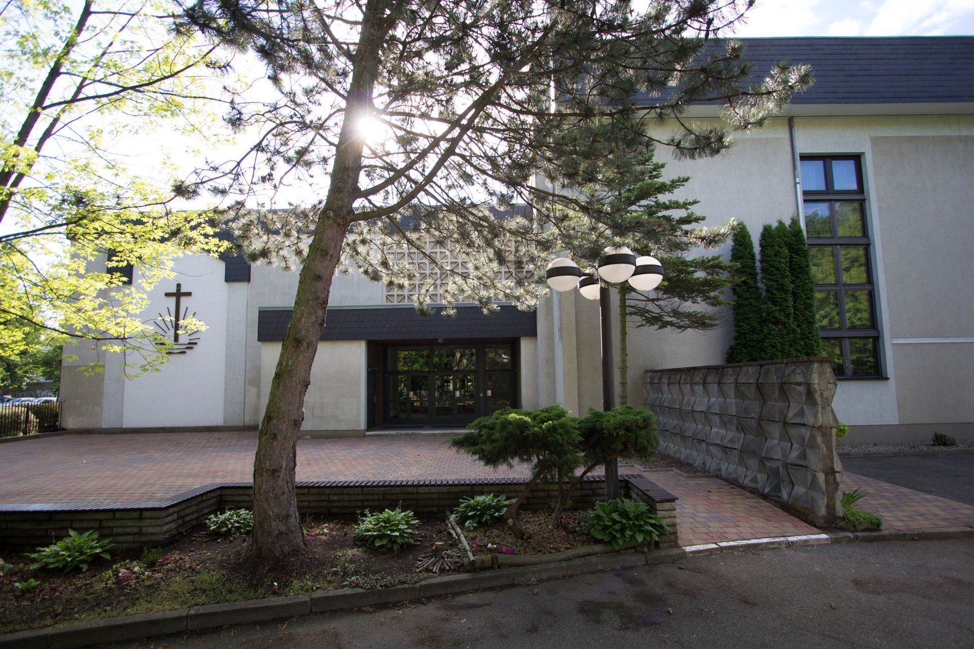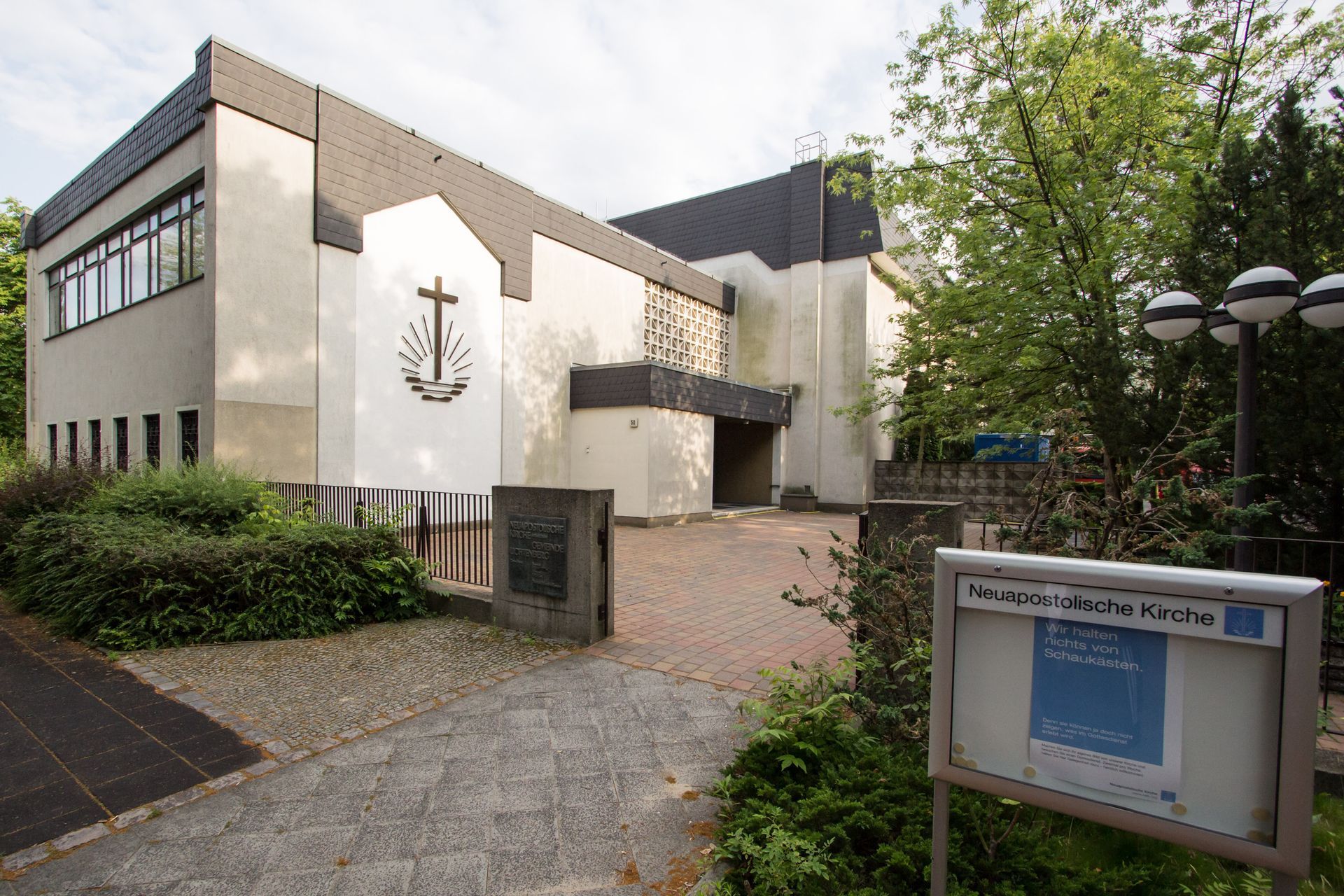 Wir schauen uns den Gemeindestandort zunächst von außen an. Sämtliche Fotos wurden nach der großen Sanierung (Sommer 1991 bis Herbst 1992) aufgenommen.