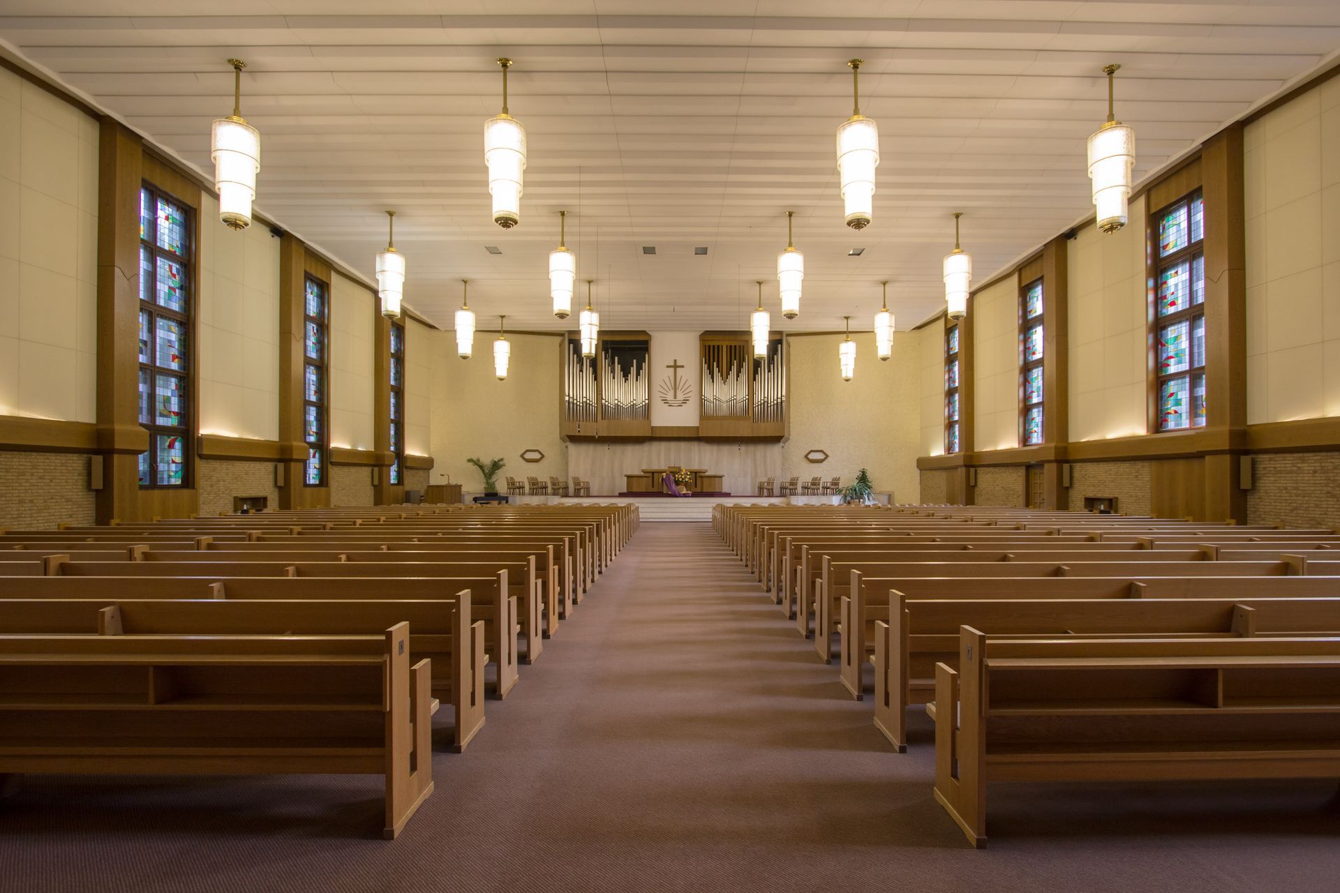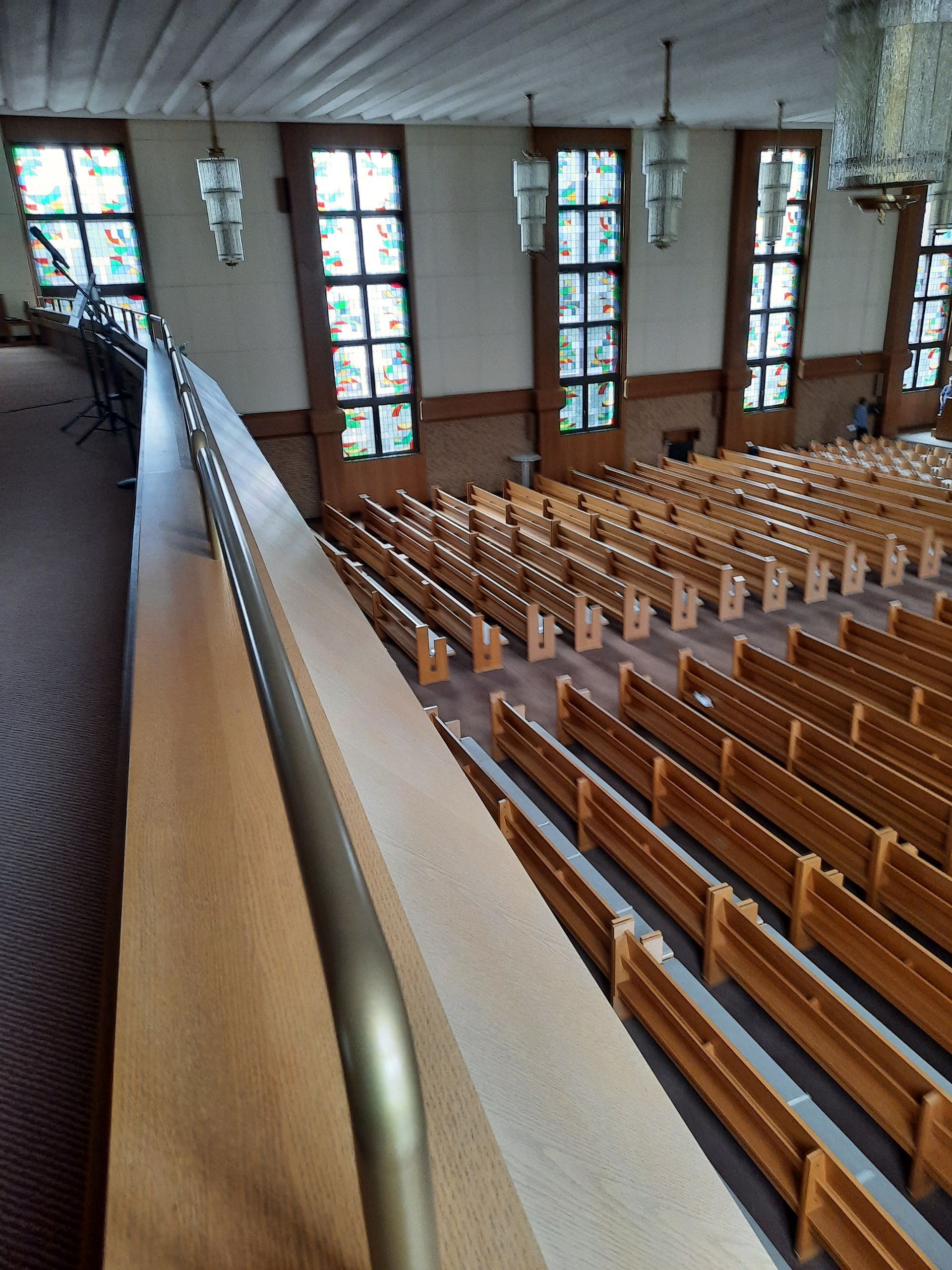 Gesangsaal: Blick zur rückwärtigen Wand mit Positiv, rechts Fensterreihe mit Blick auf den Münsterlandplatz.