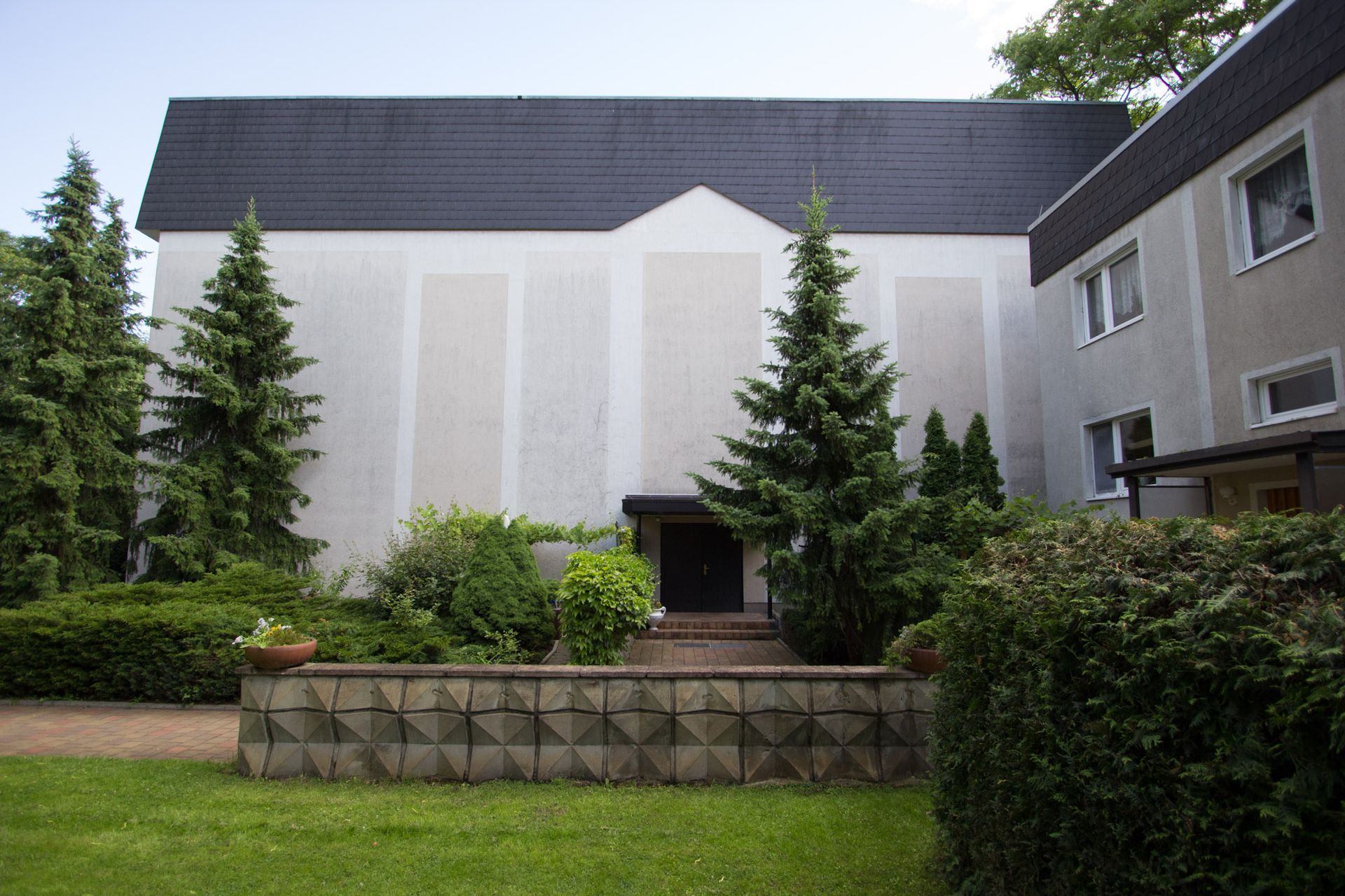 Südseite: Südgiebel des Langhauses mit Eingang zur Sakristei, rechts Wohnhaus (Plattenbau Typ WBS 70) mit vier Wohnungen.