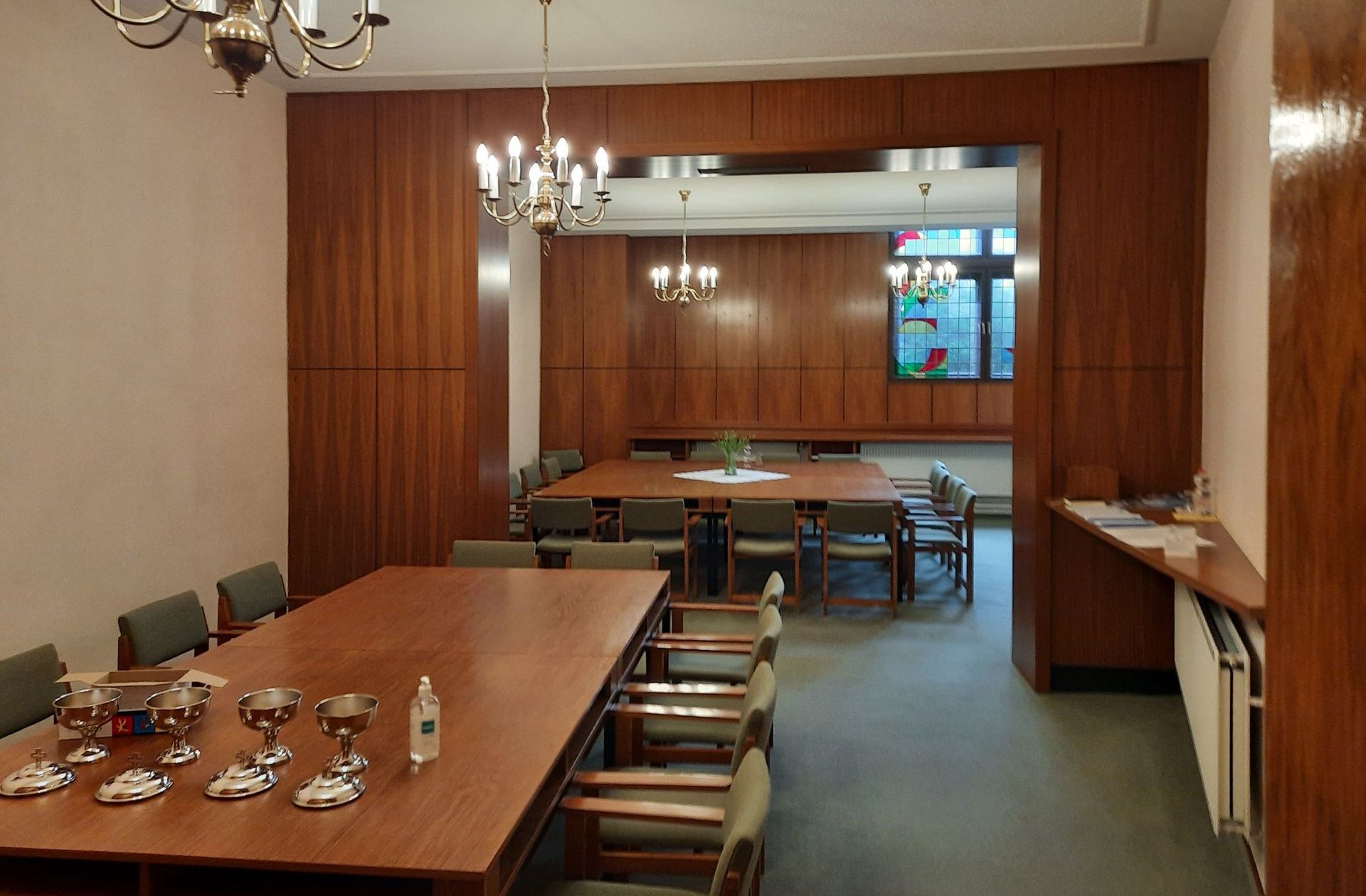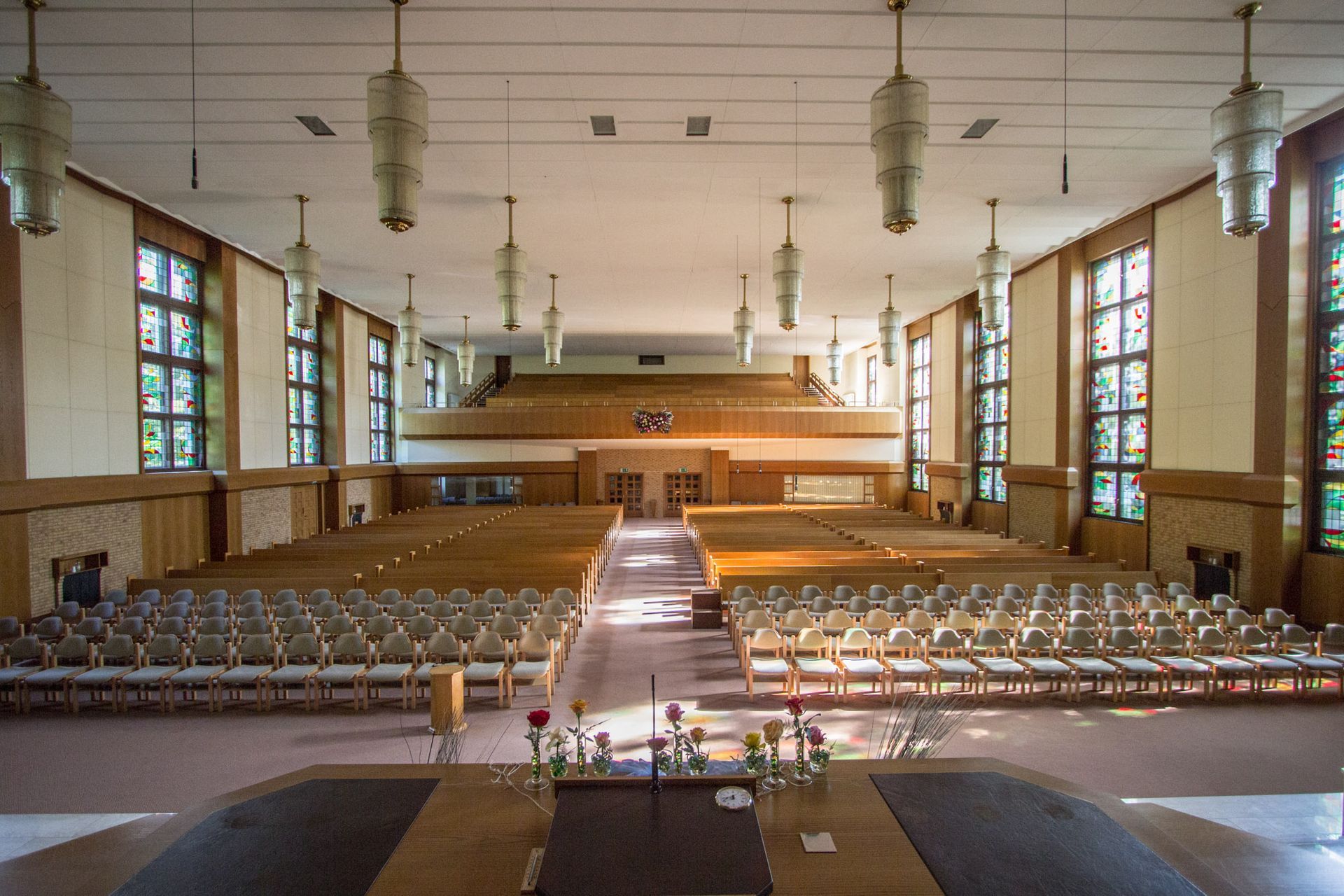 Gesangsaal: Blick zur Vorderseite, der Saal wurde sonntäglich für den Kindergottesdienst genutzt, im Weiteren für Übertragungen aus dem Hauptsaal (Bild und Ton) sowie für diverse Musikproben.