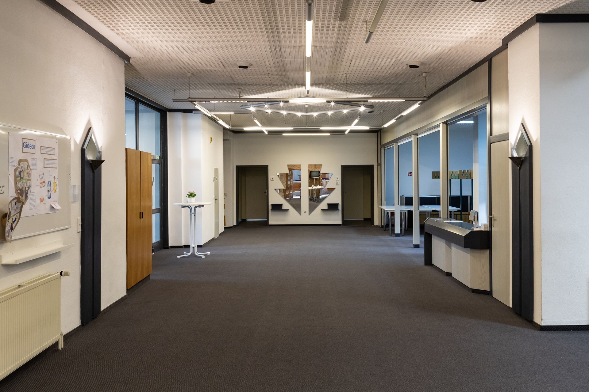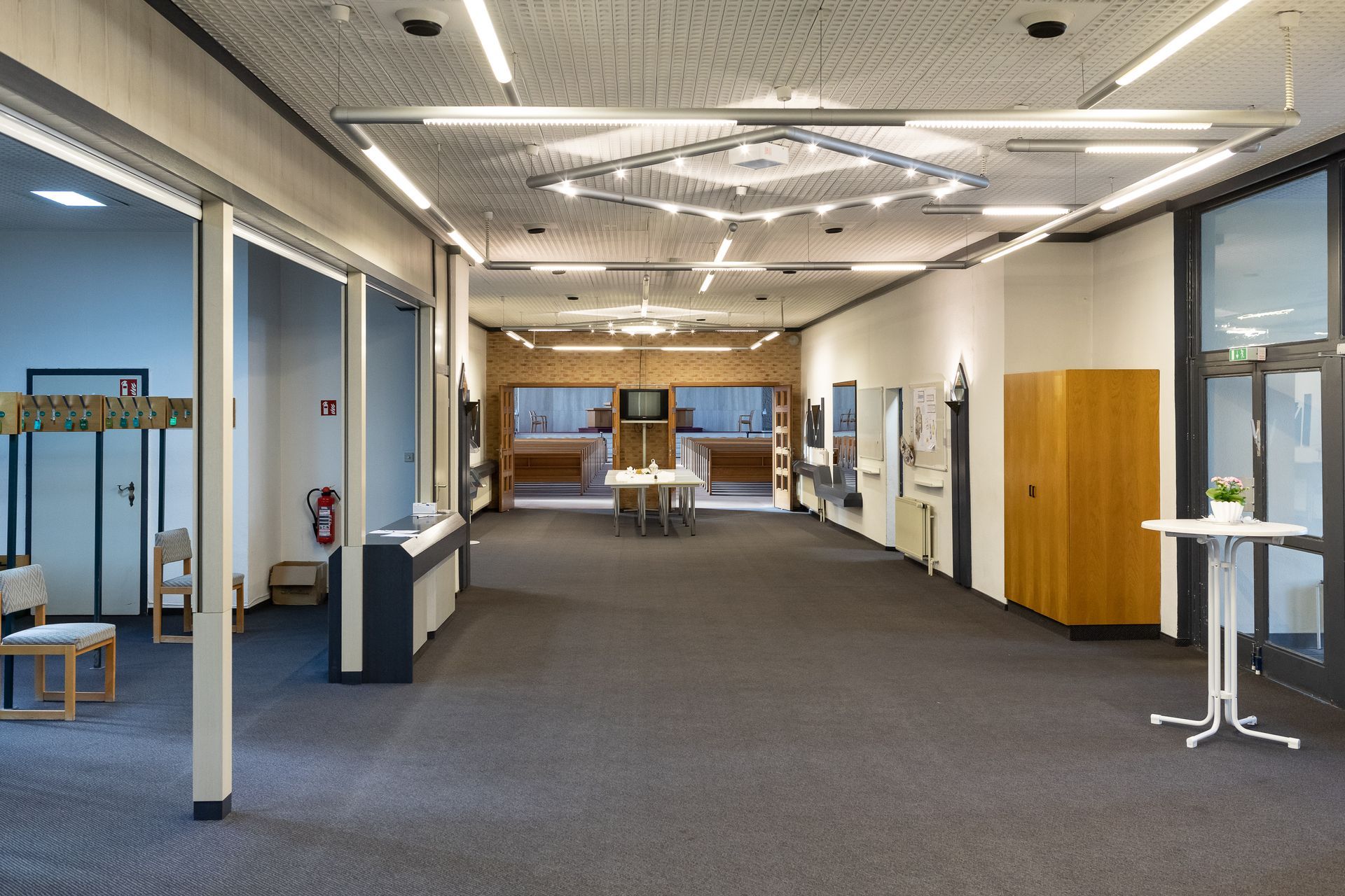 Foyer: Blick durch die offenen Saaltüren, links Garderobe.