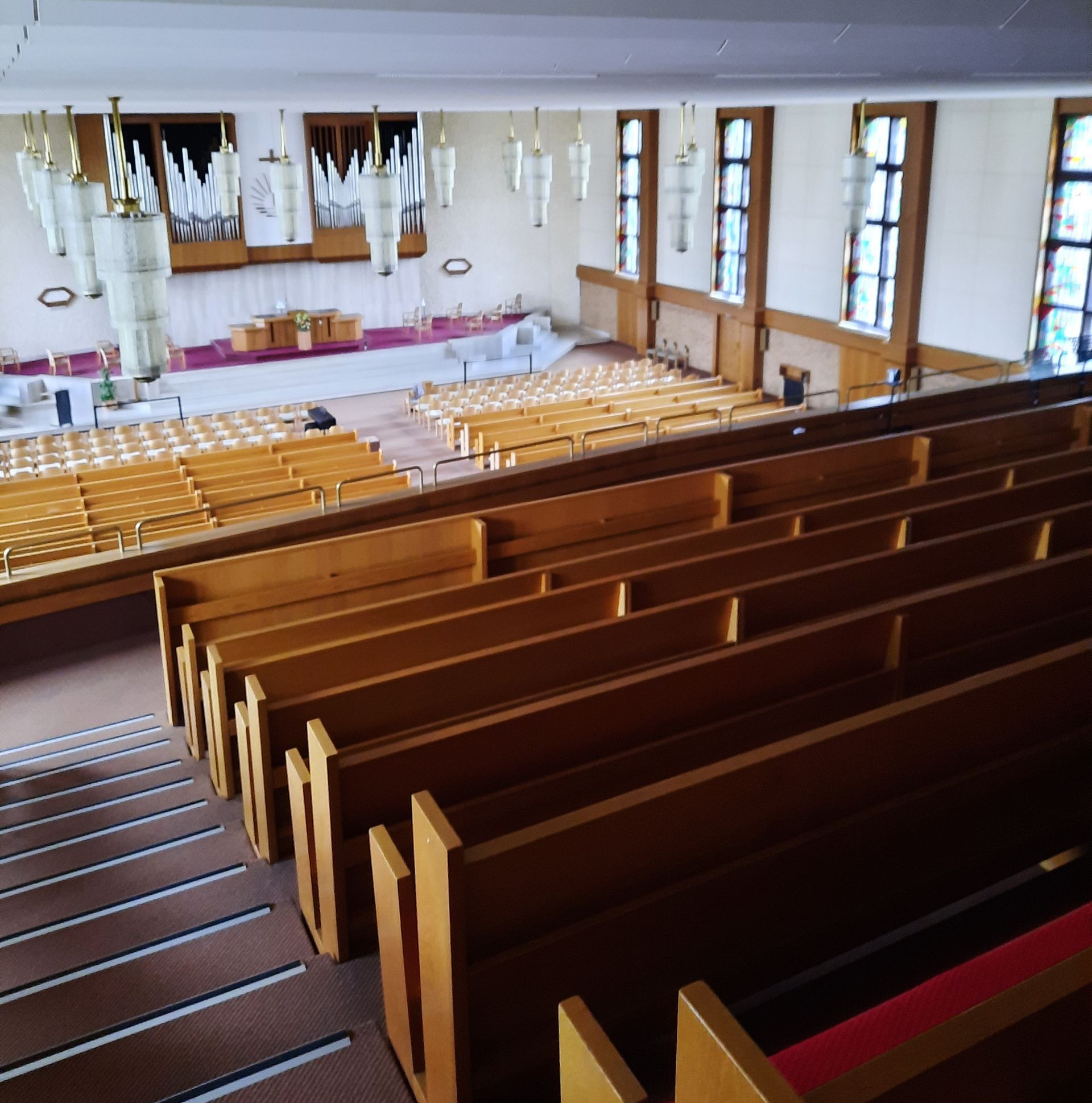 Kirchensaal: Blick vom Altar, unter der Empore Fenster rechts Übungsraum, Fenster links Mutter-Kind-Raum.