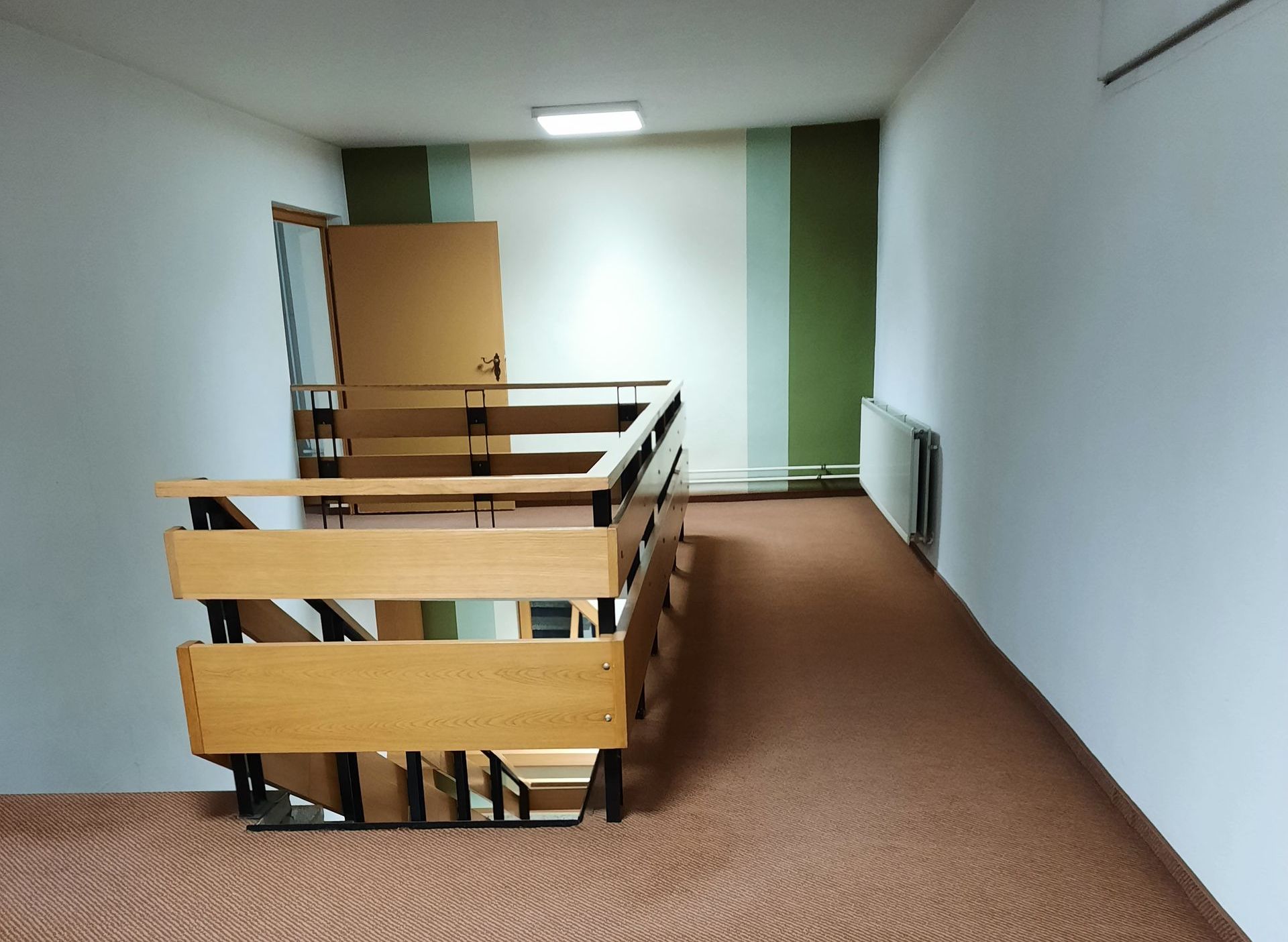 Haupttreppe: Linke Wand Anschlag für Gemeindetermine, rechts vordere Tür zur Küche, dahinter Tür zum Unterrichtsraum, hinter uns befand sich die Nebentreppe.