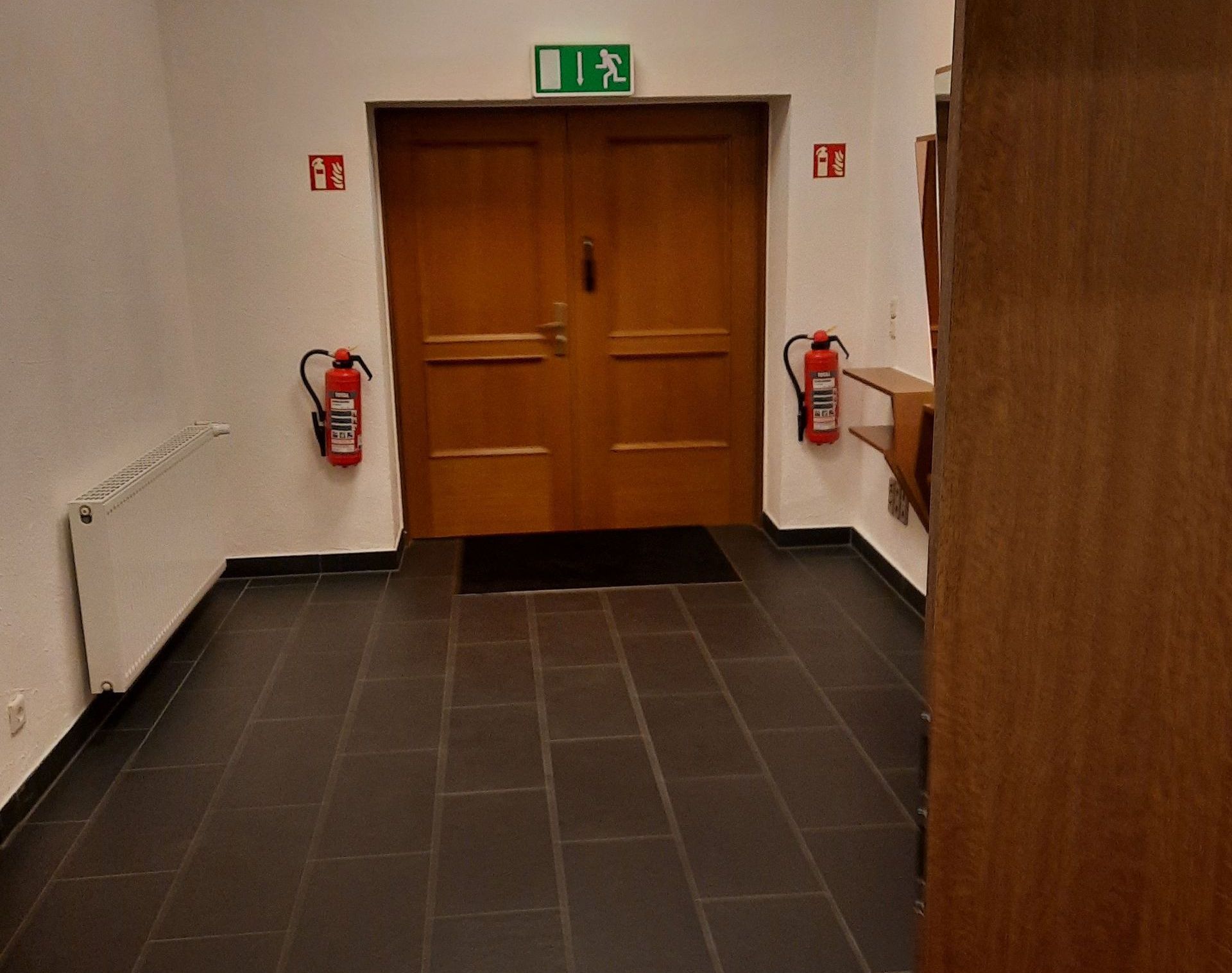 Nebentreppe: Links im Bild Zugang zur Empore Hofseite, rechts hinter uns Zugang zum oberen Foyer