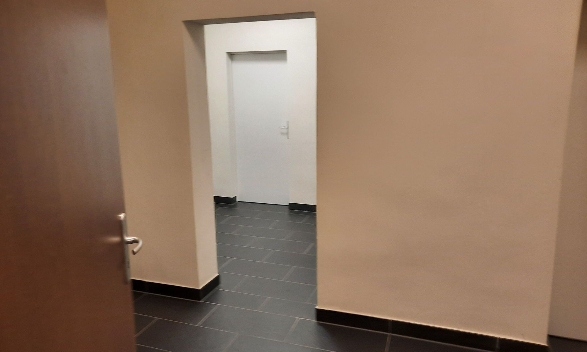 Foyer: Links der Eingang, dahinter linke Wand war der Zugang zum Erste-Hilfe-Raum, dahinter Treppe zum Keller. Geradezu befanden sich die Toiletten, rechts Garderobe, vorn rechts Zugang zur Haupttreppe.